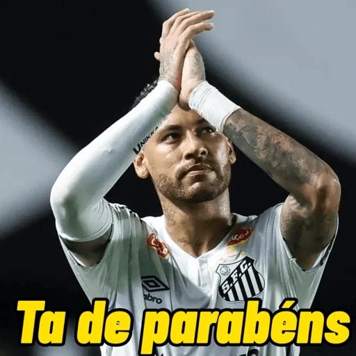 Jogador de futebol com as mãos na cabeça e expressão de alívio ou celebração, vestindo uniforme branco com texto 'Ta de parabéns' em amarelo na parte inferior.