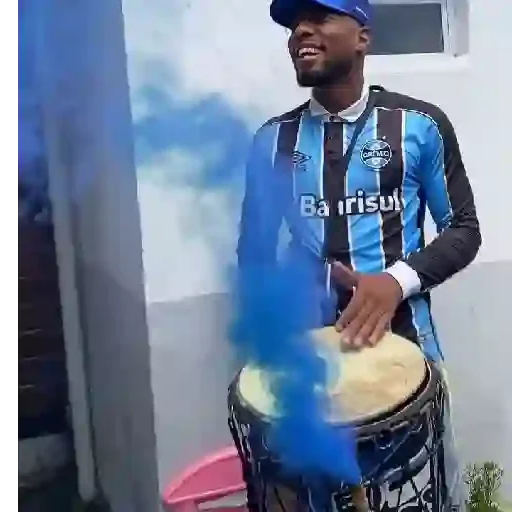 Homem negro com camisa azul e preta toca um tambor com fumaça azul saindo dele. Ele usa um boné azul e tem um bracelete branco no pulso.