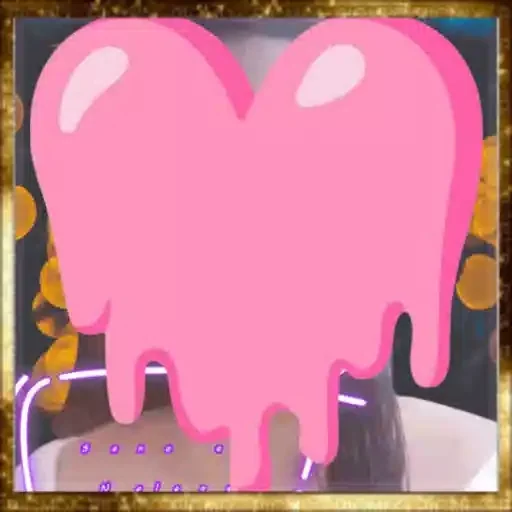 Um coração rosa derretido com reflexos brilhantes, emoldurado por um contorno dourado com fundo escuro e detalhes roxos.