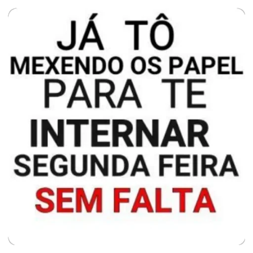 Um texto em preto e vermelho que diz 'JÁ TÔ MEXENDO OS PAPEL PARA TE INTERNAR SEGUNDA FEIRA SEM FALTA'.