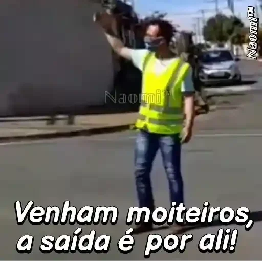 Um homem com colete refletivo amarelo e máscara facial está de pé na rua, apontando com a mão direita. Ele veste uma camisa branca e calças jeans. Abaixo dele, está escrito 'Venham moiteiros, a saída é por ali!'