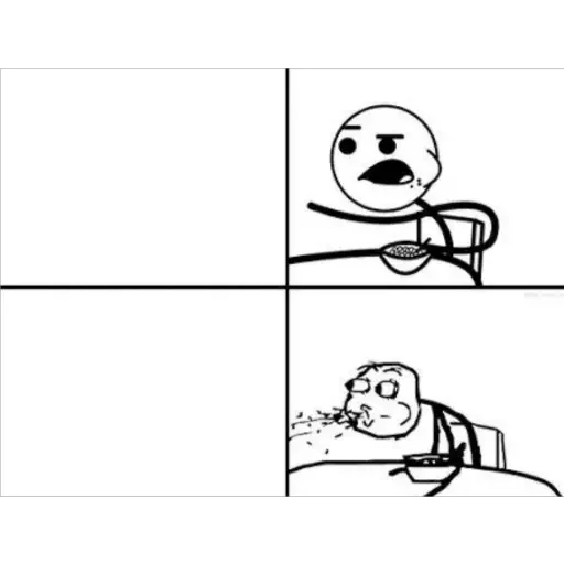 Um meme em preto e branco com dois painéis. No primeiro, um personagem com expressão de surpresa e boca aberta parece estar se aproximando de algo. No segundo, o mesmo personagem está com a boca aberta e parece estar vomitando.