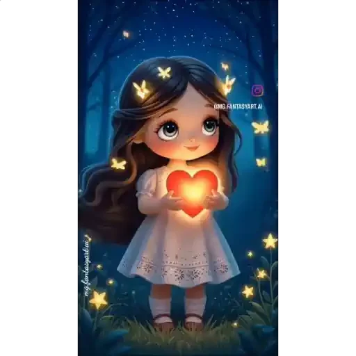 Menina de cabelos castanhos e olhos grandes segura um coração luminoso em um ambiente noturno com estrelas e borboletas.