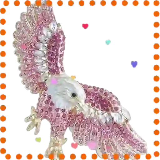Águia rosa com asas abertas, decorada com pontos coloridos e rodeada de corações, em um quadro de pontos laranja.