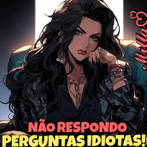Uma mulher de cabelo preto e longo, com expressão séria e um olhar direto, vestindo um blazer preto. Ela está com a mão no rosto e tem texto em vermelho e amarelo que diz 'NÃO RESPONDO PERGUNTAS IDIOTAS!'