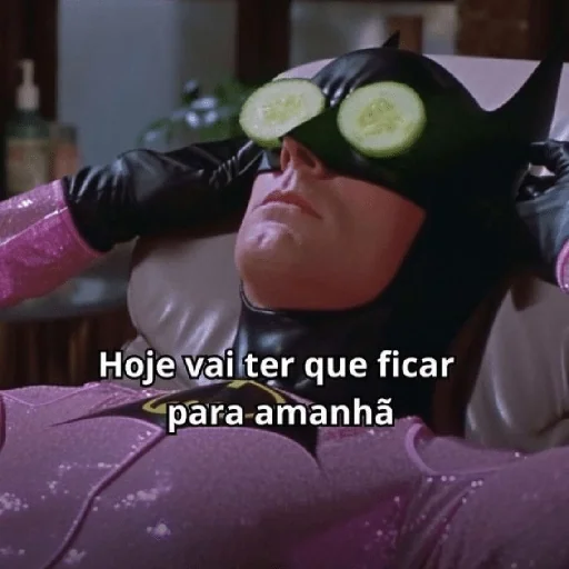 Batman relaxado com fatias de pepino nos olhos e expressão serena, em uma banheira com água quente. Sobreposto, o texto 'Hoje vai ter que ficar para amanhã'.