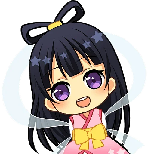 Garota de anime com cabelo preto e olhos roxos, vestindo um quimono rosa com um laço amarelo, com estrelas no cabelo.