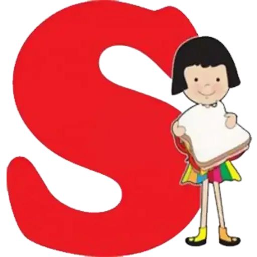 Uma menina de cabelo preto e um grande 'S' vermelho ao fundo, vestindo uma saia colorida e segurando um livro.