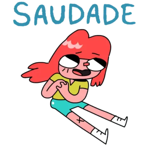 Uma menina de cabelo vermelho com expressão de saudade, vestindo uma camiseta amarela e shorts azuis, com a palavra 'SAUDADE' escrita acima dela.