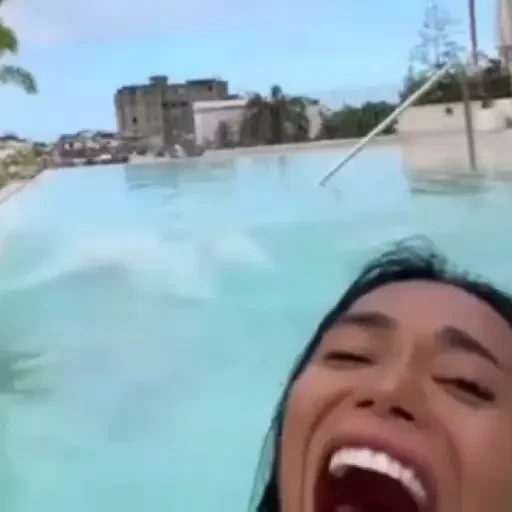 Rosto de uma mulher com a boca aberta e olhos fechados, como se estivesse rindo, em frente a uma piscina com um prédio ao fundo.