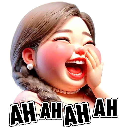 Garota com trança e olhos fechados, mão na boca, rindo. Texto 'AH AH AH AH' em preto com contorno branco.