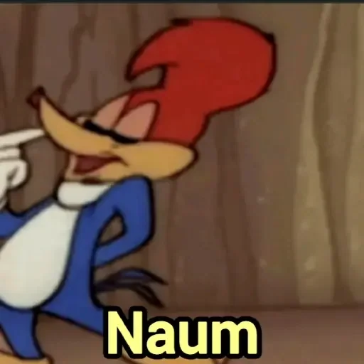 Um cartoon de um pássaro com penas azuis, bico laranja e crista vermelha, fazendo um gesto com a mão e dizendo 'Naum'.