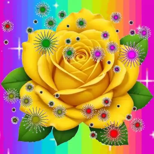Uma rosa amarela grande com folhas verdes, decorada com flores e joias coloridas, em um fundo arco-íris.