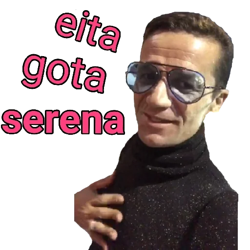 Um homem com óculos de sol e um suéter preto, com a mão no peito, ao lado da frase 'eita gota serena'.