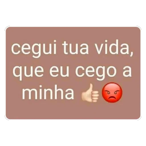 Um retângulo marrom com texto em branco que diz 'cegui tua vida, que eu cego a minha' acompanhado de um ícone de polegar para cima e um rosto vermelho de emoji com expressão de descontentamento.