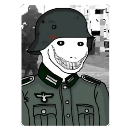 Um soldado alemão com um sorriso largo e olhos arregalados, usando um capacete e uniforme militar. Fundo preto e branco.