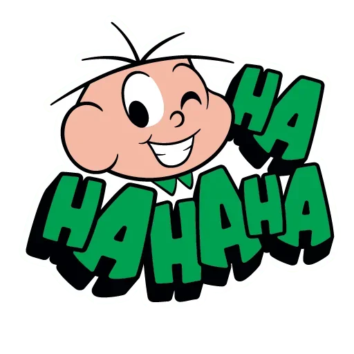Um menino de olhos arregalados e cabelos desalinhados ri com a boca aberta, com a palavra 'HAHAHA' em letras grandes e verdes abaixo dele.