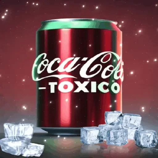 Uma lata de Coca-Cola vermelha com o texto 'TOXICO' embaixo da marca, rodeada de cubos de gelo e faíscas no fundo.