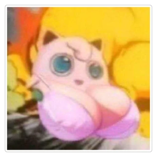 Jigglypuff com expressão confusa ou surpresa, olhos arregalados e corados, com cabelo amarelo e orelhas pontiagudas marrons.