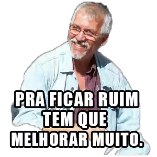 Um homem mais velho com cabelo grisalho e um sorriso irônico, vestindo uma camisa branca, com o texto 'PRA FICAR RUIM TEM QUE MELHORAR MUITO.' sobreposto.