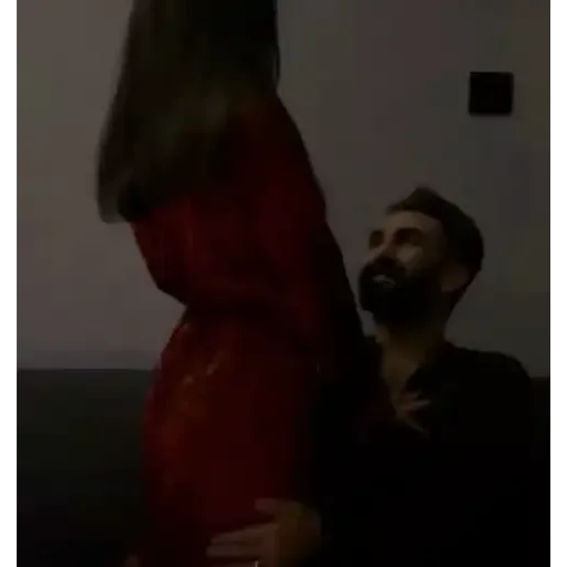 Um homem com barba e camisa preta olha para cima com uma expressão surpresa enquanto uma mulher de vestido vermelho está ao lado, com as mãos na barriga.