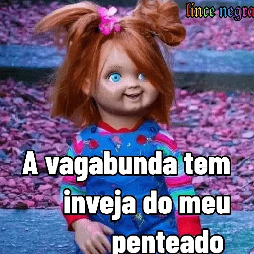 Uma boneca de aparência assustadora com cabelo ruivo e um laço rosa, vestida com uma roupa azul e rosa, com o texto "A vagabunda tem inveja do meu penteado" sobreposto.