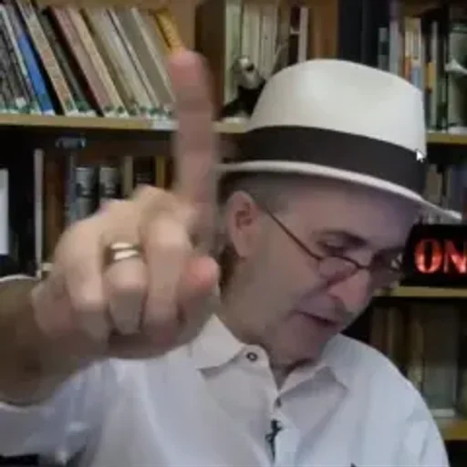 Um homem mais velho com óculos e um chapéu branco fazendo um gesto com o dedo indicador para cima, em frente a uma estante de livros.