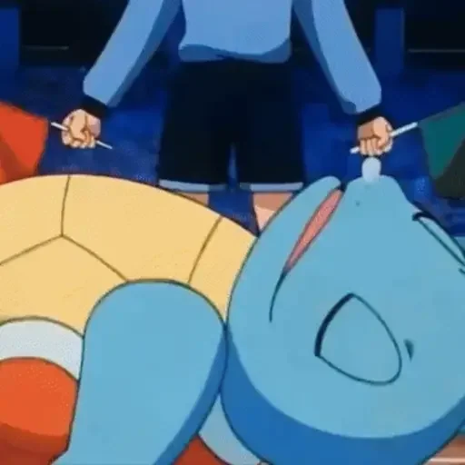 Um menino segura duas seringas enquanto um Pokémon azul com uma marca vermelha na testa e uma concha nas costas parece dormir ou estar inconsciente.