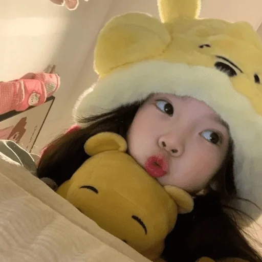 Uma jovem com um chapéu de pelúcia amarelo e branco, com uma expressão fofa e a língua para fora, abraçando um ursinho de pelúcia amarelo.