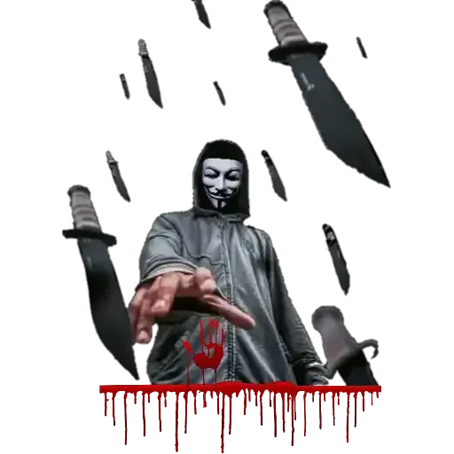 Um homem com máscara e capuz, vestido de preto, estende a mão com sangue na palma. Facas pairam no ar ao redor dele, com sangue pingando na parte inferior.