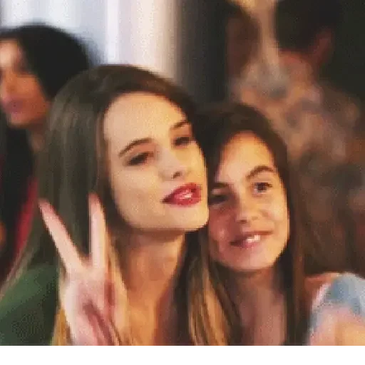 Duas mulheres fazem uma selfie, uma com a mão fazendo um V e a outra sorrindo ao lado.