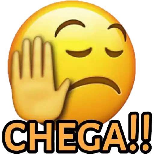 Um emoji amarelo com a mão na frente do rosto e expressão de desaprovação, com o texto 'CHEGA!!' em letras laranjas.