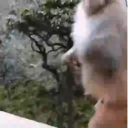Um gato branco olhando para fora com uma árvore e vegetação ao fundo.