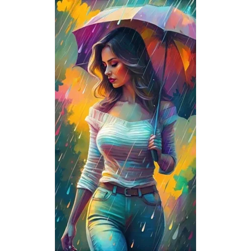 Mulher com guarda-chuva colorido em meio à chuva, vestindo camisa branca e calça jeans.