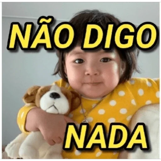 Uma bebê com expressão séria, segurando um ursinho de pelúcia, com o texto 'NÃO DIGO NADA' em letras amarelas.