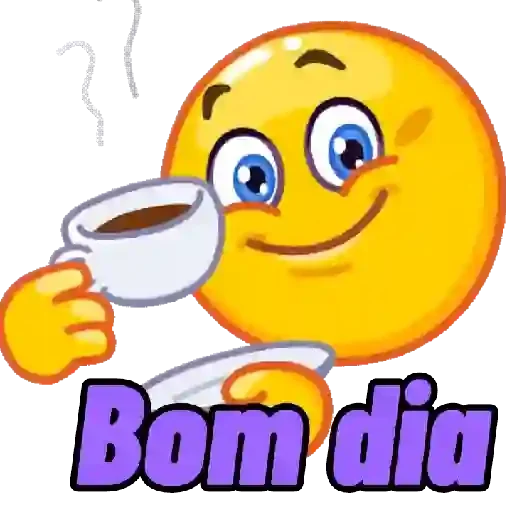 Um emoji amarelo sorridente com uma xícara de café na mão e o texto 'Bom dia' em roxo.