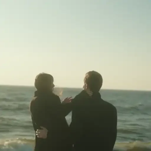 Dois homens de costas para o mar ao pôr do sol, um com o braço sobre o ombro do outro.