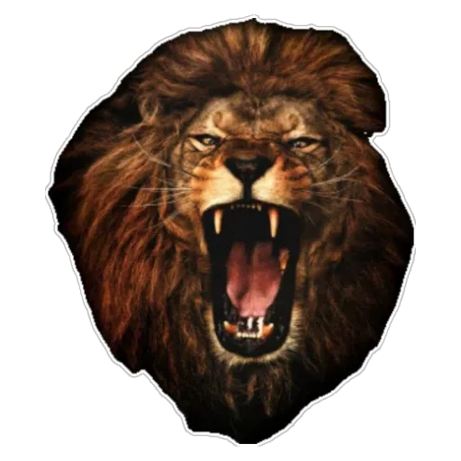 Cabeça de um leão com a boca aberta e os dentes à mostra, com uma juba espessa e marrom.