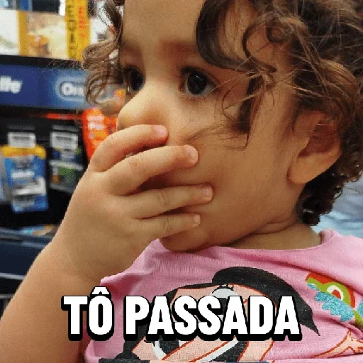 Menino pequeno com cabelo castanho e camiseta rosa, com a mão na boca e expressão surpresa, com o texto 'TÔ PASSADA' em letras brancas.