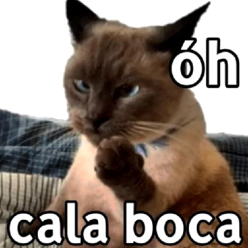 Gato marrom com expressão séria e mão levantada, dizendo 'óh cala boca'