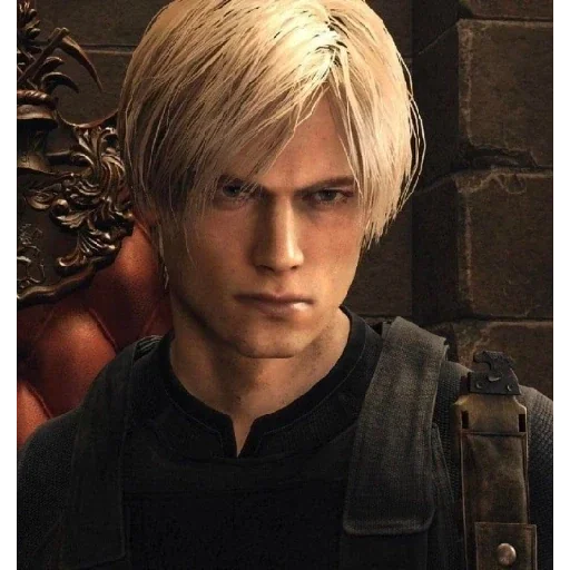 Personagem de jogo com cabelo loiro curto e expressão séria, vestindo roupas escuras.