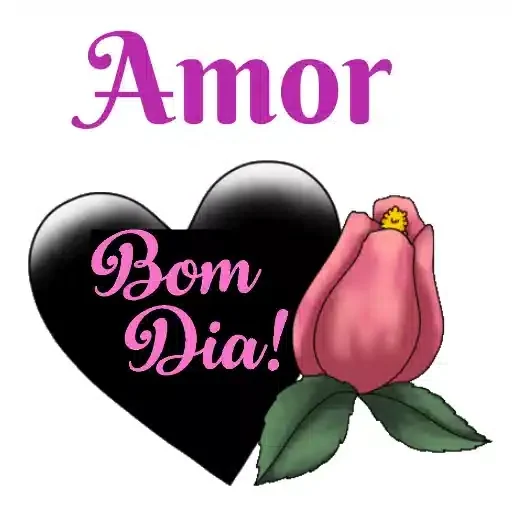 Um coração preto com uma rosa rosa e as palavras 'Amor Bom Dia!' em rosa. A rosa tem folhas verdes e um centro amarelo.