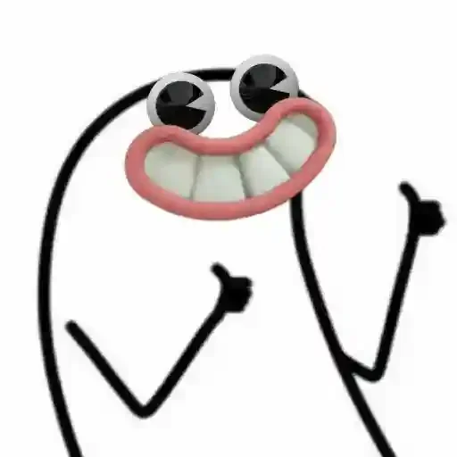 Um desenho de um personagem com um sorriso largo e dentes grandes, olhos arregalados e braços levantados.