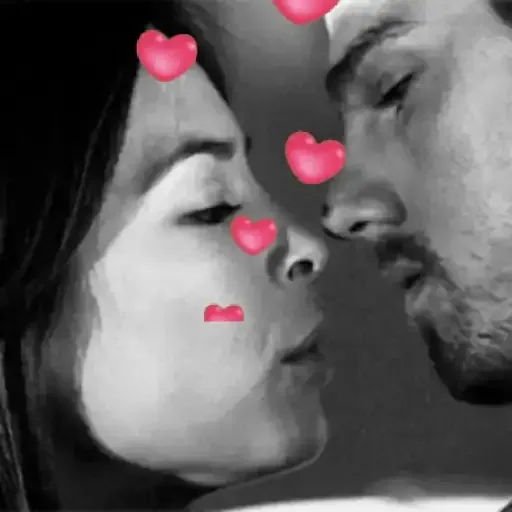 Um casal prestes a se beijar, com corações rosa ao redor de seus rostos.