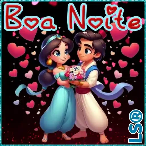 Um casal de personagens de desenho animado, um príncipe e uma princesa, se abraçando e trocando flores, com o texto 'Boa Noite' em vermelho com corações ao fundo.