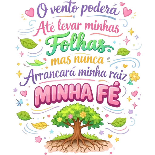 Uma árvore com raízes profundas e folhas verdes, rodeada de elementos decorativos como corações, folhas e estrelas, com o texto "O vento poderá Até levar minhas Folhas mas nunca Arrancará minha raíz MINHA FÉ" em cores diversas.