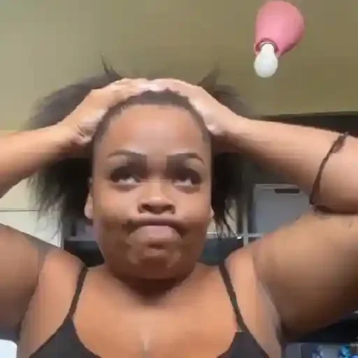 Rosto de uma mulher negra com expressão de alegria ou loucura, cabelos desarrumados e boca aberta mostrando os dentes.