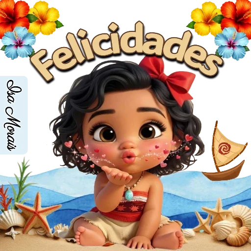 Uma menina com cabelo escuro e um laço vermelho no cabelo, sentada na praia com estrelas-do-mar e conchas, fazendo um gesto de felicitação. A palavra 'Felicidades' está escrita acima dela, decorada com flores.