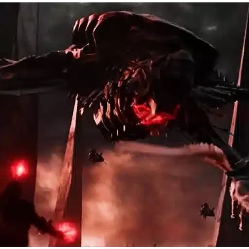 Uma criatura sombria e assustadora com olhos vermelhos brilhantes pairando no ar, com uma atmosfera sombria e assustadora ao fundo.