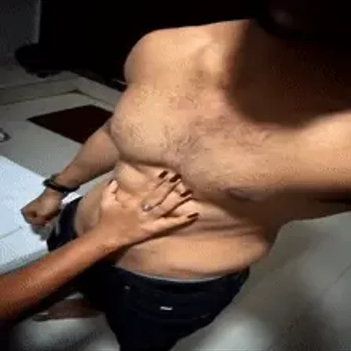 Braço e mão de uma pessoa com camisa branca contra um fundo roxo claro.